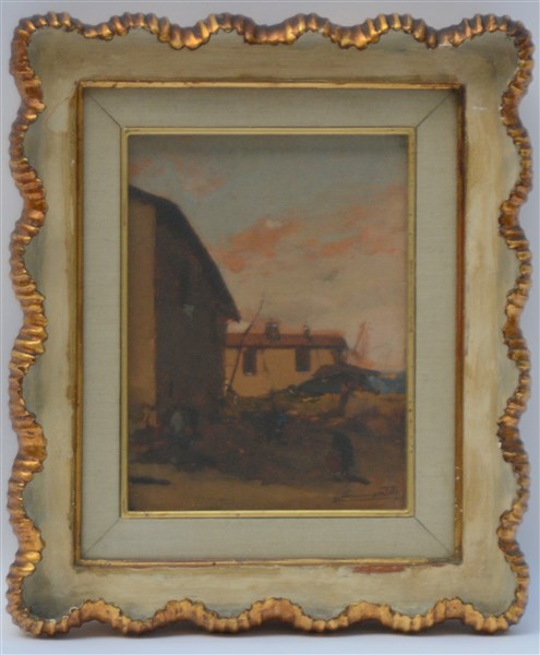 Firma indecifrata "Figure in un paesaggio" olio su compensato (cm 24x18) Firmato in basso a destra. In cornice