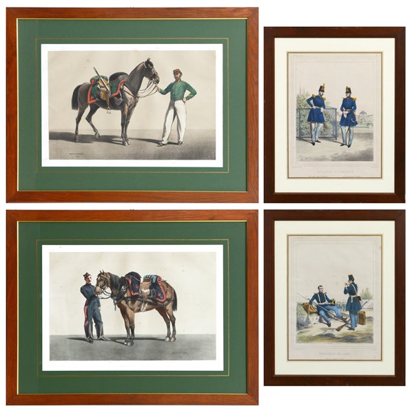 Lotto di due coppie di litografie francesi a colori. Due rappresentano figurini militari inerenti all'esercito borbonico del Regno delle due Sicilie, metà secolo XIX. Le altre, cavallo con le sue bardature affiancato da un servente in uniforme di fatica dell'esercito l'esercito francese del II Impero. In cornice (difetti)