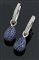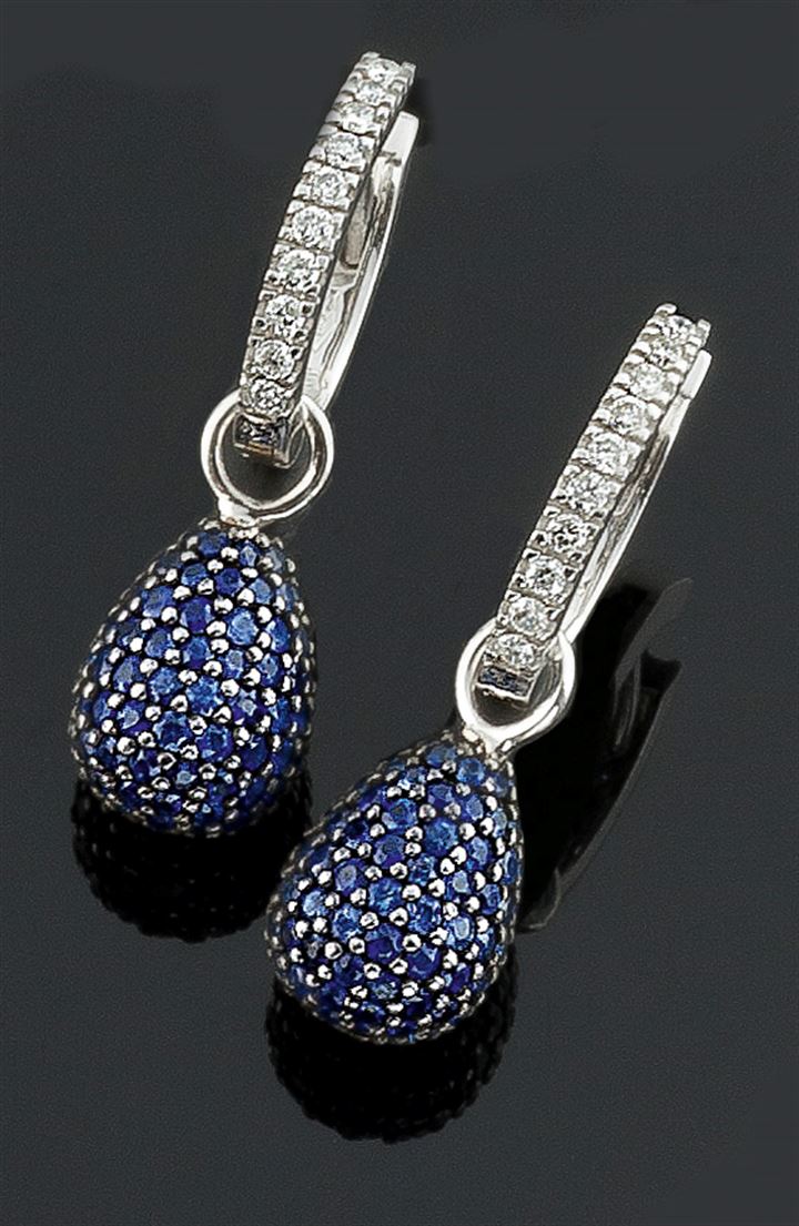 Coppia di orecchini in oro bianco, a cerchio, in diamanti taglio brillante per complessivi ct 0,30 ca; due gocce pendenti con zaffiri taglio rotondo per complessivi ct 2,50 ca