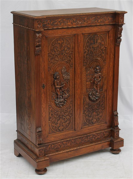 Mobile in stile rinascimentale a due ante intagliate a putti e volute. Fine secolo XIX (cm 105x157x56) (difetti)