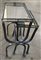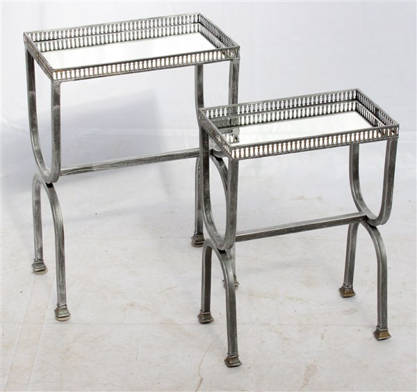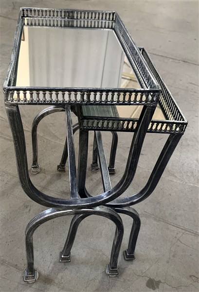 Lotto composto da due tavolini con ringhiere traforate in metallo e piani a specchio. Misure diverse