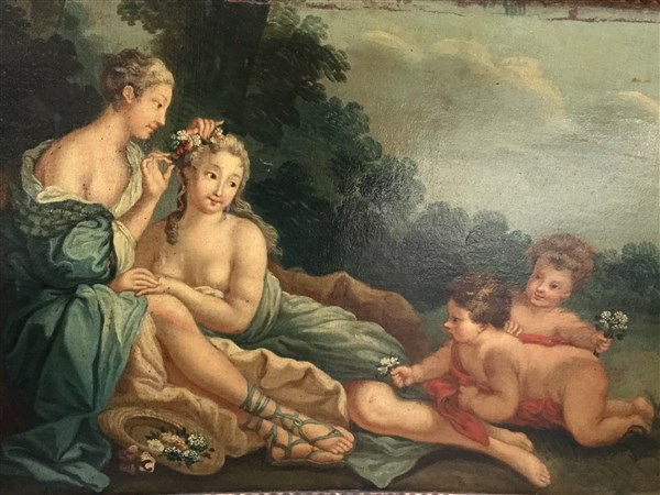 Scuola del secolo XIX "Figure femminili e putti in un paesaggio" olio su tela s