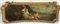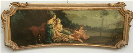 Scuola del secolo XIX "Figure femminili e putti in un paesaggio" olio su tela sagomata (cm 50,5x145,5) In cornice laccata e dorata