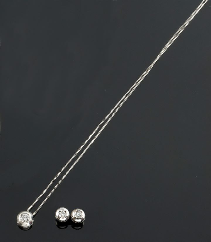 Demi-parure in oro bianco composta da una coppia di orecchini a lobo recanti due diamanti taglio brillante ed un punto luce con diamante taglio brillante, complessivi ct 0.30 ca