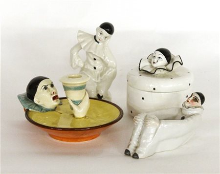 Lotto composto da una bugia, una scatola con coperchio e due sculture in porcellana raffiguranti Pierrot. Secolo XX. (h max cm 16) (lievi difetti)