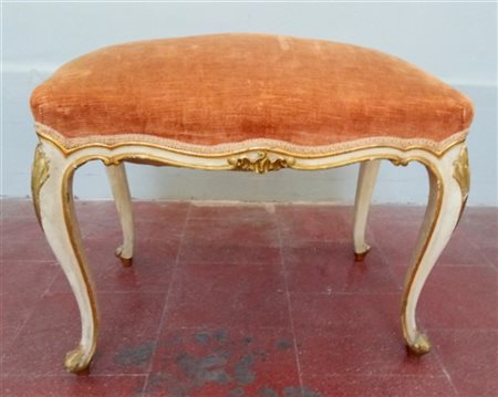 Panchetto con gambe mosse in legno laccato e dorato, seduta rivesta in velluto