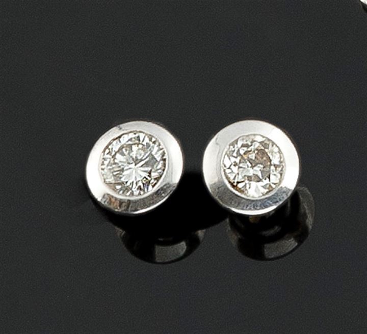 Coppia di orecchini in oro bianco, a lobo, con due diamanti taglio brillante per complessivi ct 0,50 ca