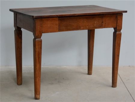 Tavolino da centro con cassetto sottopiano e quattro gambe rastremate. Secolo XIX (cm 93x74x58) (difetti)