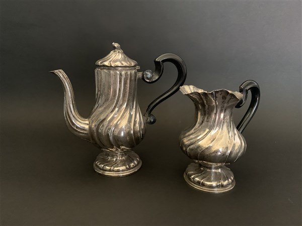 Teiera e caffettiera in rame argentato con manico in legno ebanizzato (difetti)