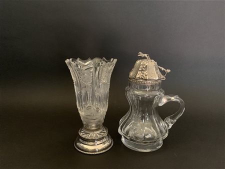 Lotto composto da un boccale da birra in vetro con tappo in argento e un vasetto in vetro con base in argento (difetti)