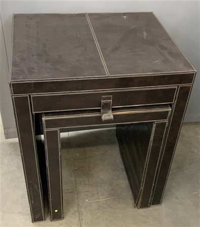 Set di due tavolini a nido di cui uno con cassetto, rivestiti in cuoio color testa di moro. Italia, secolo XX. (cm max 49x60x40) (difetti)