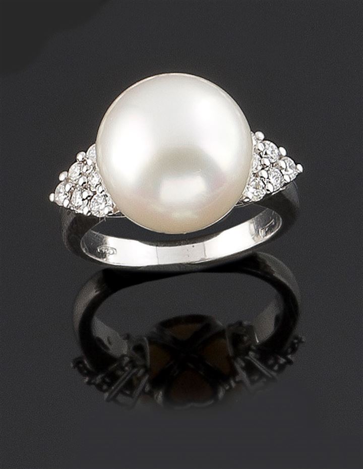 Anello oro bianco con perla australiana del diam di mm 13,5, ai lati diamanti taglio brillante