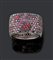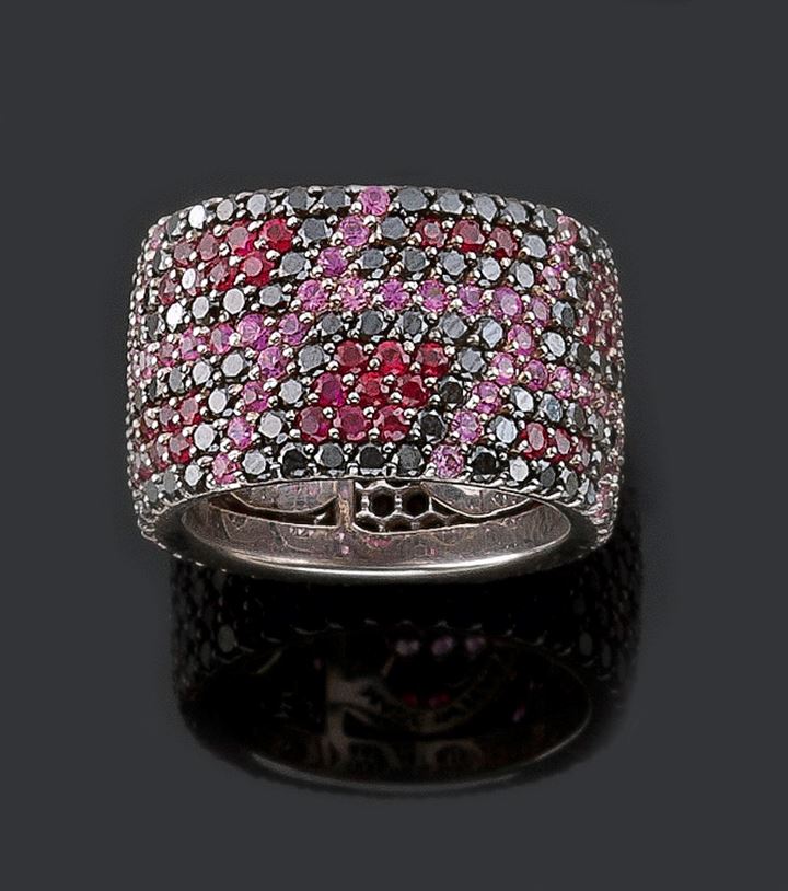 Anello in oro bianco, a fascia, con diamanti neri per complessivi ct 3,80 ca, zaffiri rosa taglio rotondo
