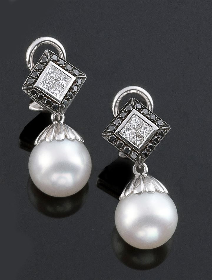 Coppia di orecchini in oro bianco con due perle australiane pendenti del diam di mm 12,2 a 12,4