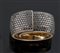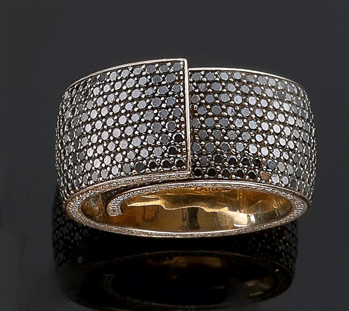 Anello in oro giallo, firmato "Ricci, a fascia, particolare forma a spirale, interamente con pavè di diamanti taglio brillante di colore nero per complessivi ct 7,0 ca (tre mancanti); sul bordo diamanti taglio brillante di colore bianco per complessivi ct 1,0 ca