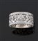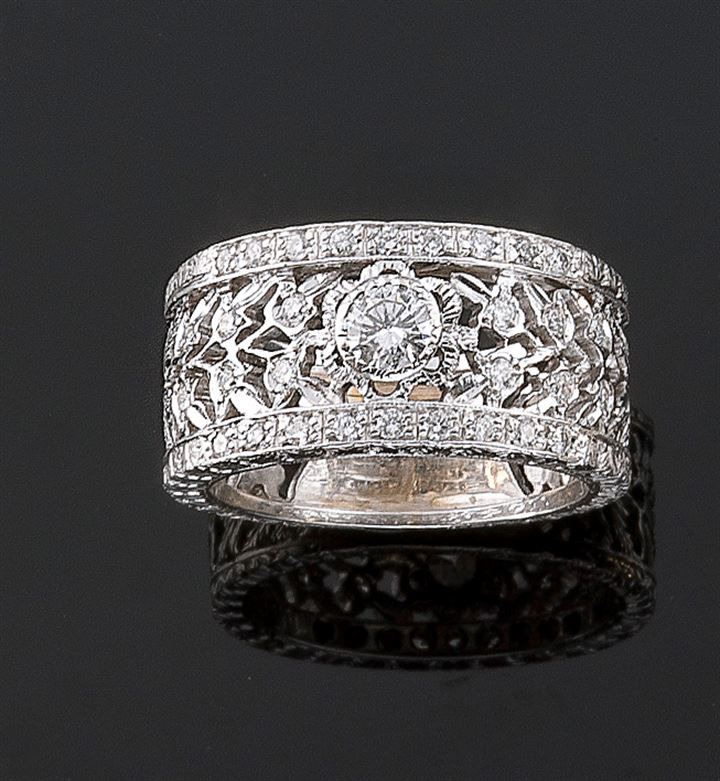 Anello in oro bianco, firmato "Buccellati", a fascia, lavorato a pizzo con al centro diamante taglio brillante di ct 0,25 ca e piccoli diamanti taglio brillante sui bordi 0,25 ca