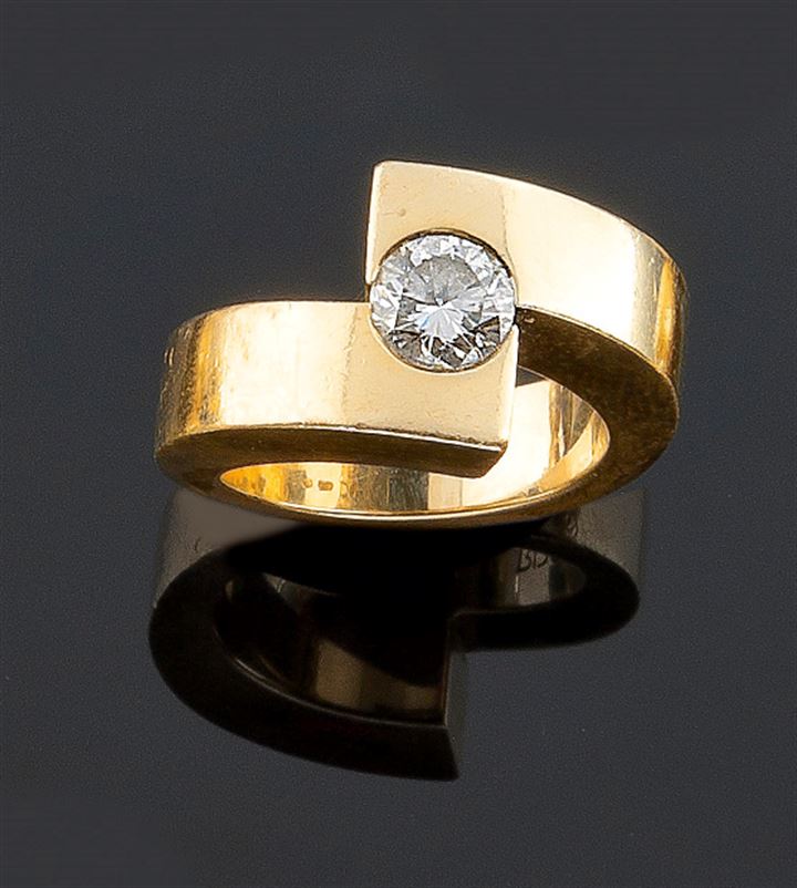 Anello in oro bianco giallo, firmato "Ricci", modello contrariè, con al centro diamante taglio brillante di ct 0,90 ca