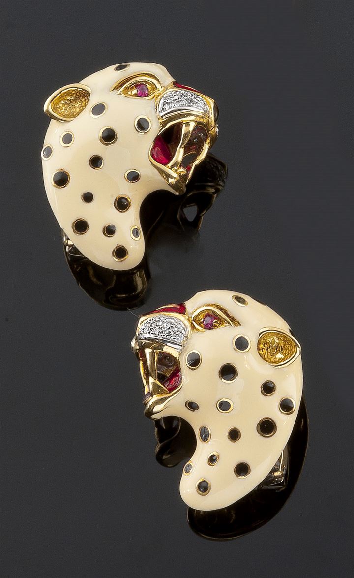Coppia di orecchini in oro giallo, firmati "Fasano", a forma di testa di giaguaro, interamente