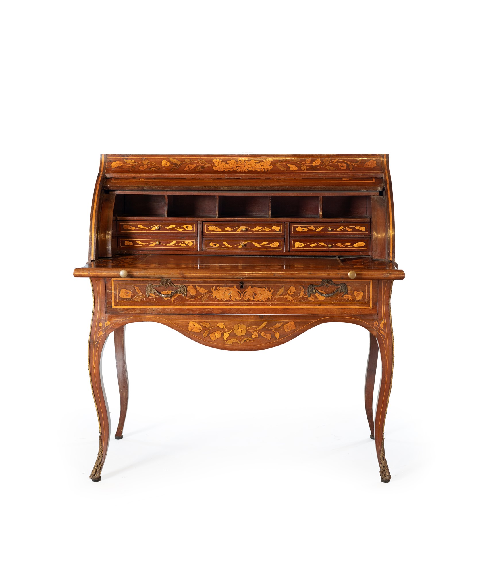 Scrittoio a rullo da parete in mogano, Olanda, XIX secolo - con fitta ornamentazione a motivi naturalistici e coppe in legno di frutto; poggiante su gambe sagomate, reca un cassetto nella fascia sormontato da piano scrittoio estraibile a consentire l'apertura del rullo; all'interno cinque scomparti e tiretti. - cm 103x95x47