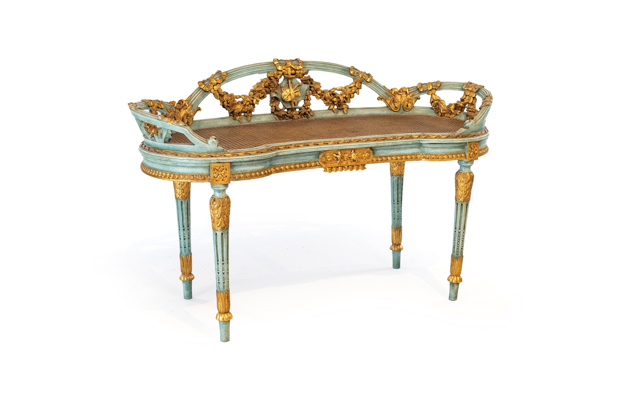 Panchetta in legno laccato verde, fine XIX secolo - seduta sagomata rivestita in paglia di Vienna, sormontata da un basso fregio intagliato in forma di verghe da cui si dipartono ghirlande intagliate; gambe rastremate scanalate. - cm 69x106x44