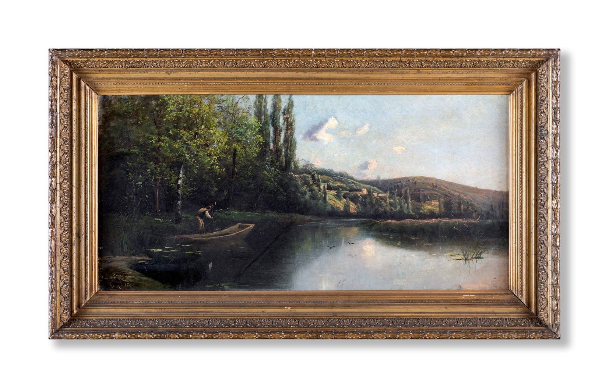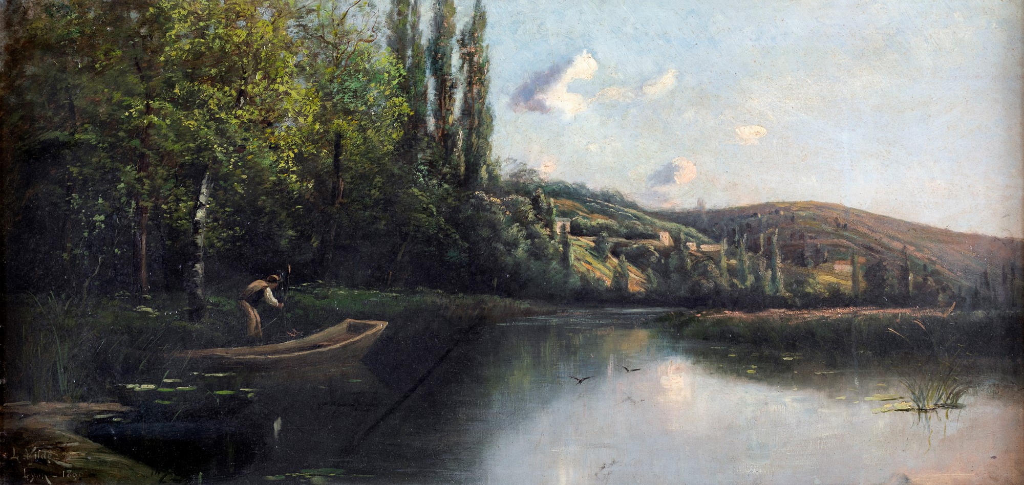 Pittore francese del XIX Secolo - Paesaggio fluviale con imbarcazione - Firmato e datato a sinistra: L. Vilde Lyon 1890 - cm 46x94