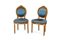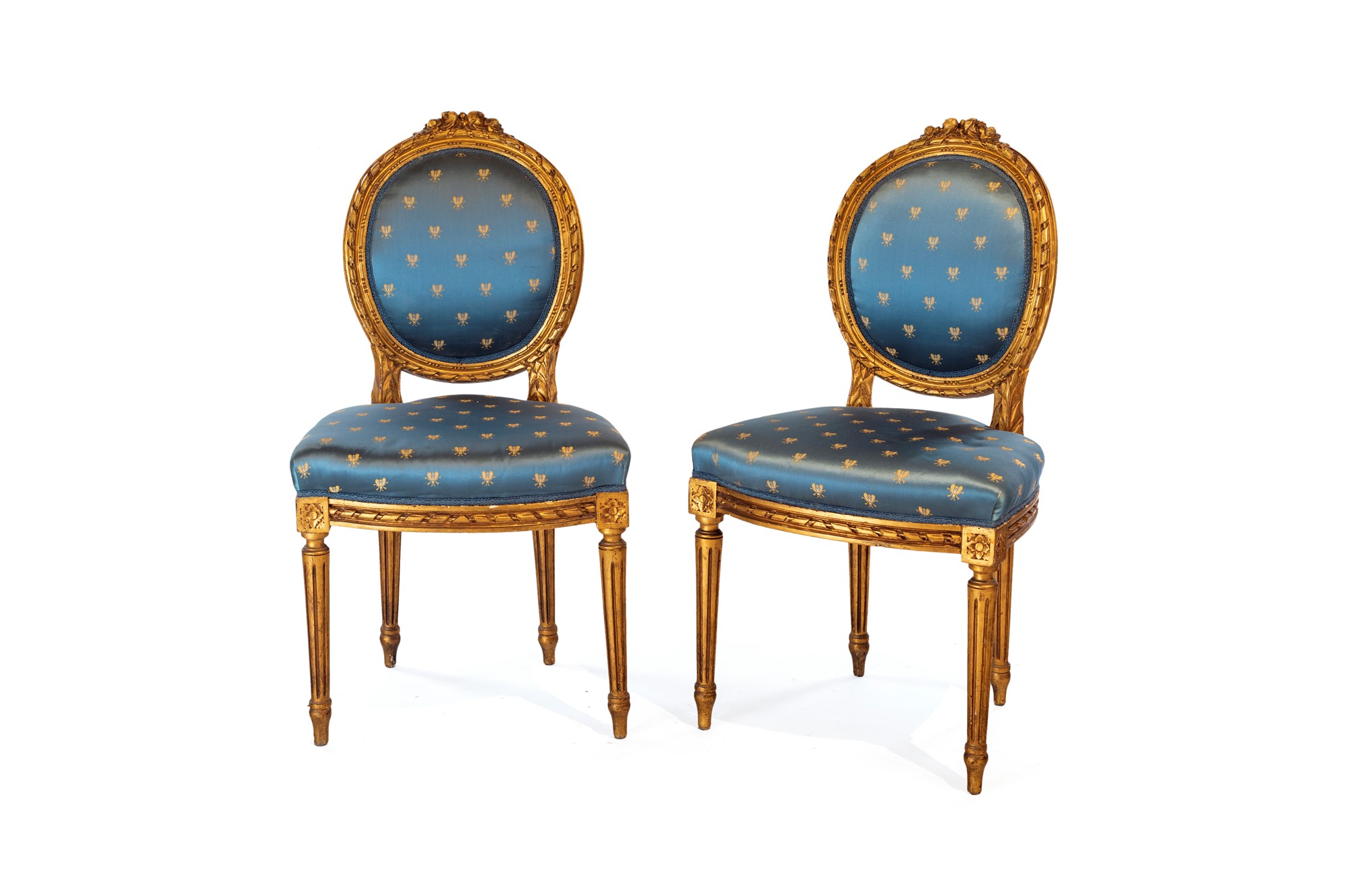 Coppia di sedie in legno dorato, fine del XIX secolo - con cornici percorse da nastro ritorto intagliato centrate da rilievi fioriti; schienali e sedili rivestiti in raso azzurro con disegno ad api, gambe rastremate scanalate. - cm 90x48x43