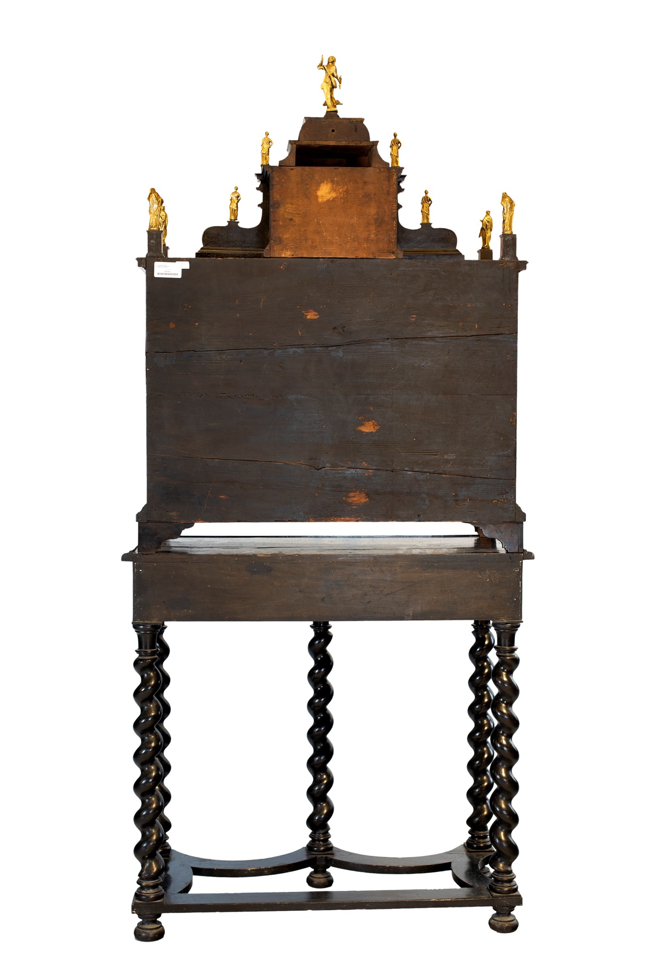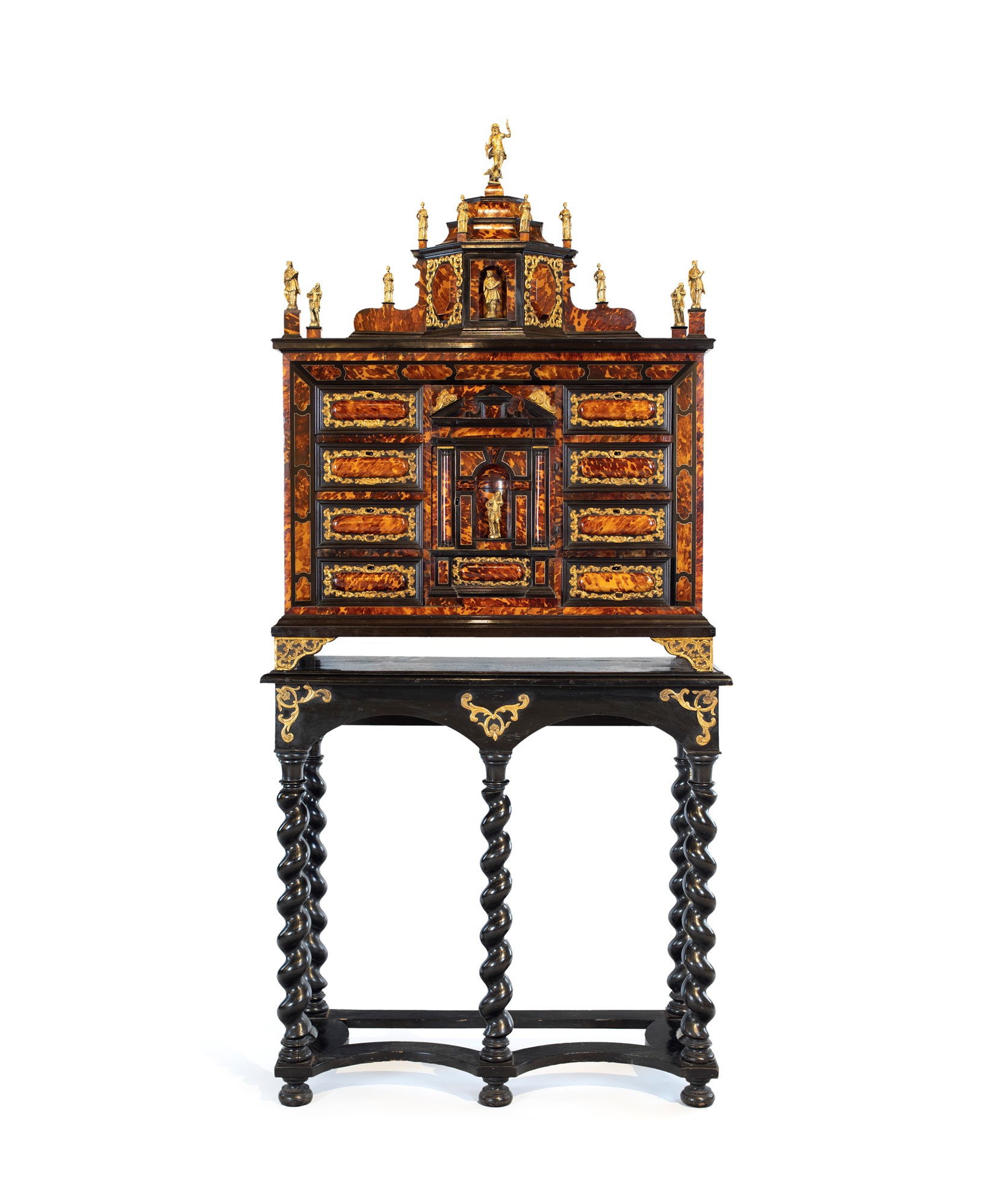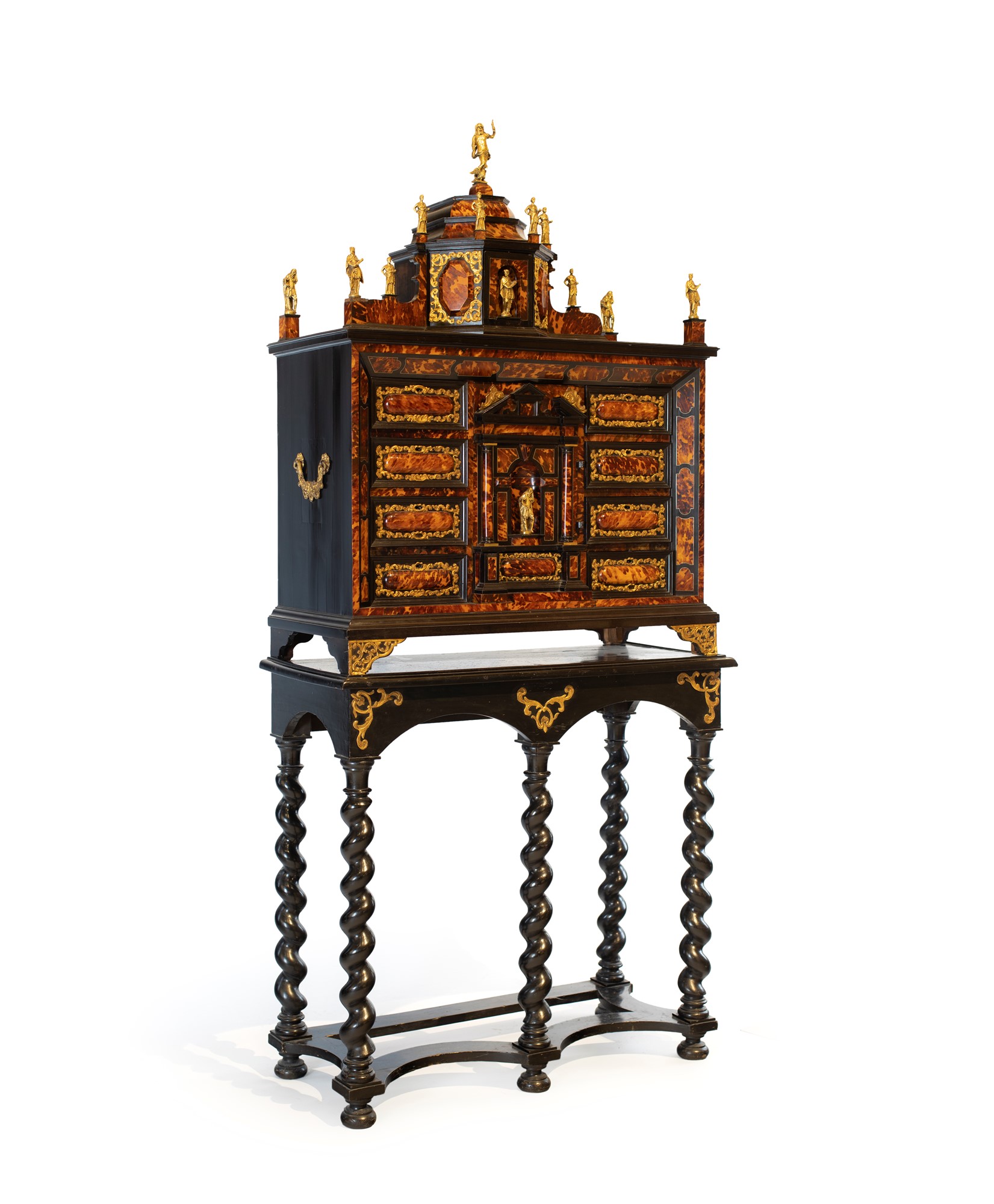 Stipo in legno ebanizzato con inserti in tartaruga, Sicilia, XVIII secolo - con facciata di impostazione architettonica centrata da nicchia affiancata da tiretti in colonna; sulla sommità figure scultoree in bronzo dorato; base con gambe tortili riunite da traverse. - cm 192x89x39