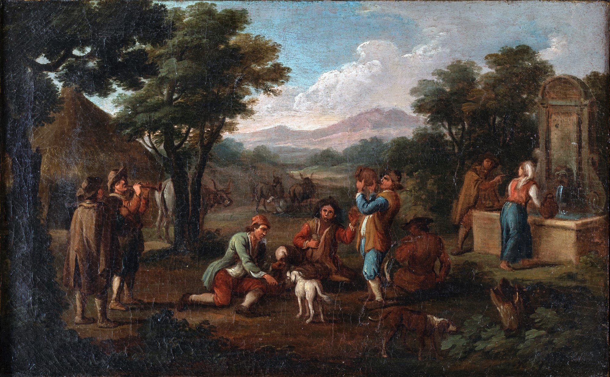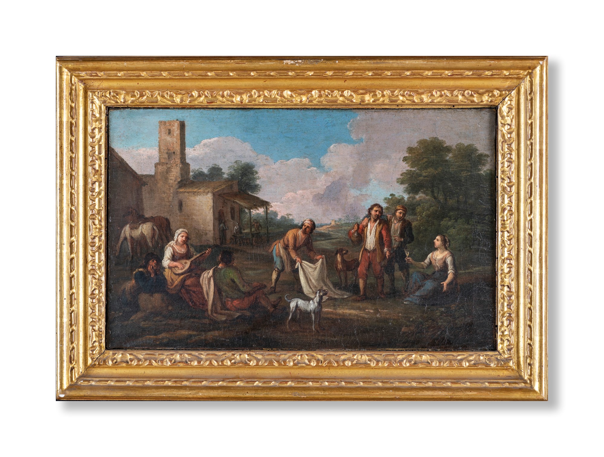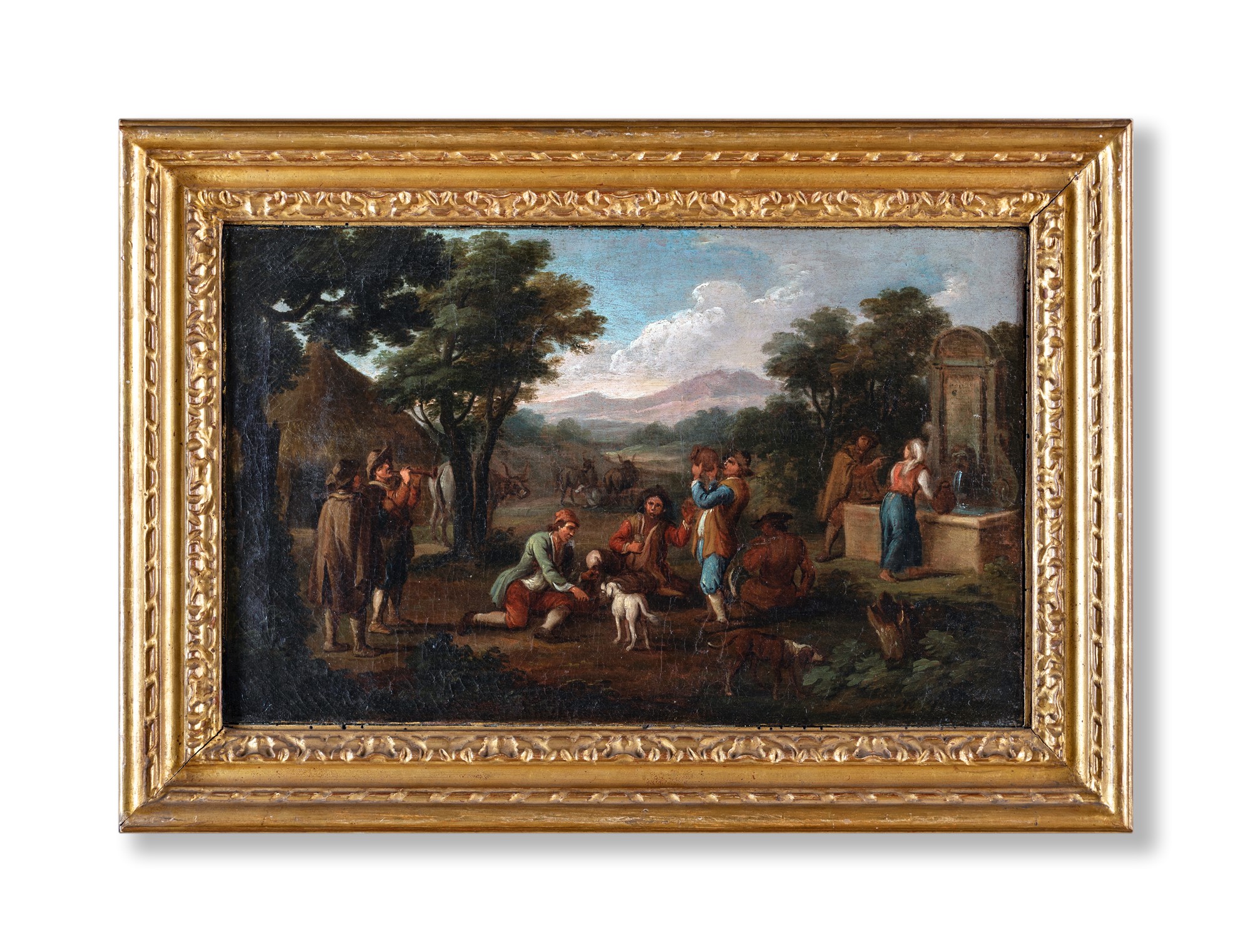 Michelangelo Cerquozzi - a) Scena di genere con coloni e viandanti b) Cacciatori in sosta - Entro cornice dorata. - cm 30x48