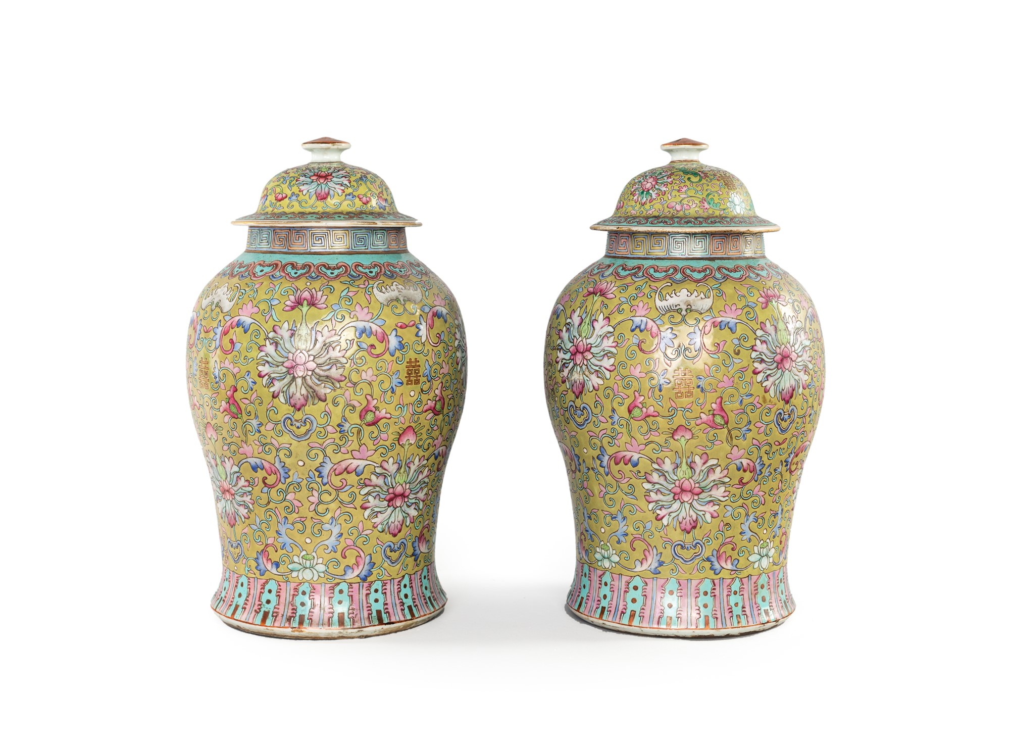 Coppia di vasi con coperchio in porcellana, Cina - decorati in policromia a fiori e figure di pipistrello su fondo verde. - altezza cm 46