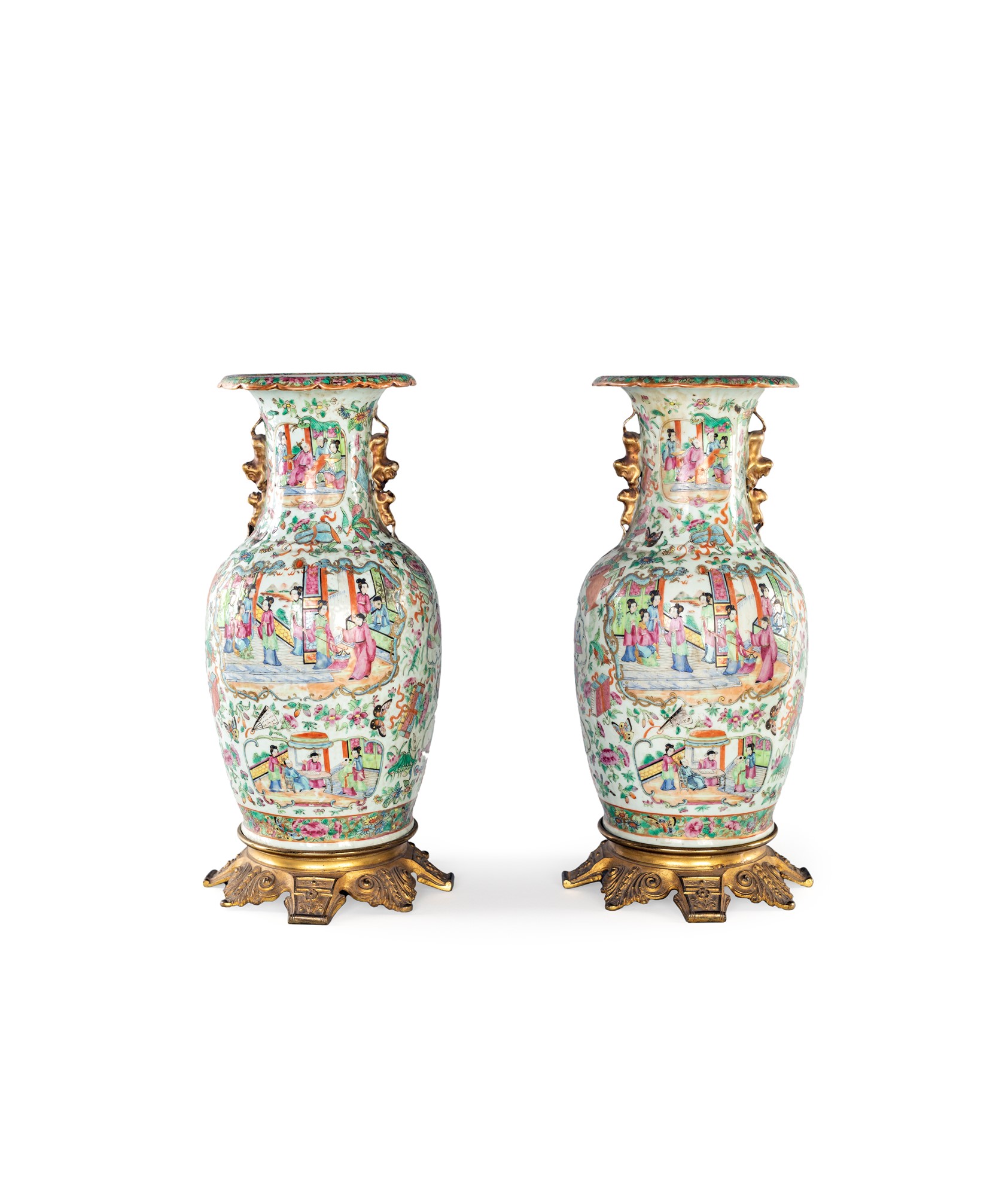 Coppia di vasi in porcellana e bronzo, Cina - con corpo a balaustro e fitta decorazione dipinta in vivace policromia a scene di genere animate da personaggi; brevi anse plastiche dorate impreziosiscono il collo; base in bronzo dorato. - altezza cm 50