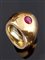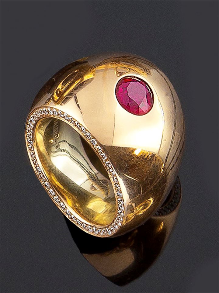 Anello in oro giallo, firmato "Ricci", a fascia, con al centro rubino taglio ovale; sul bordo diamanti taglio brillante per complessivi ct 0,60 ca