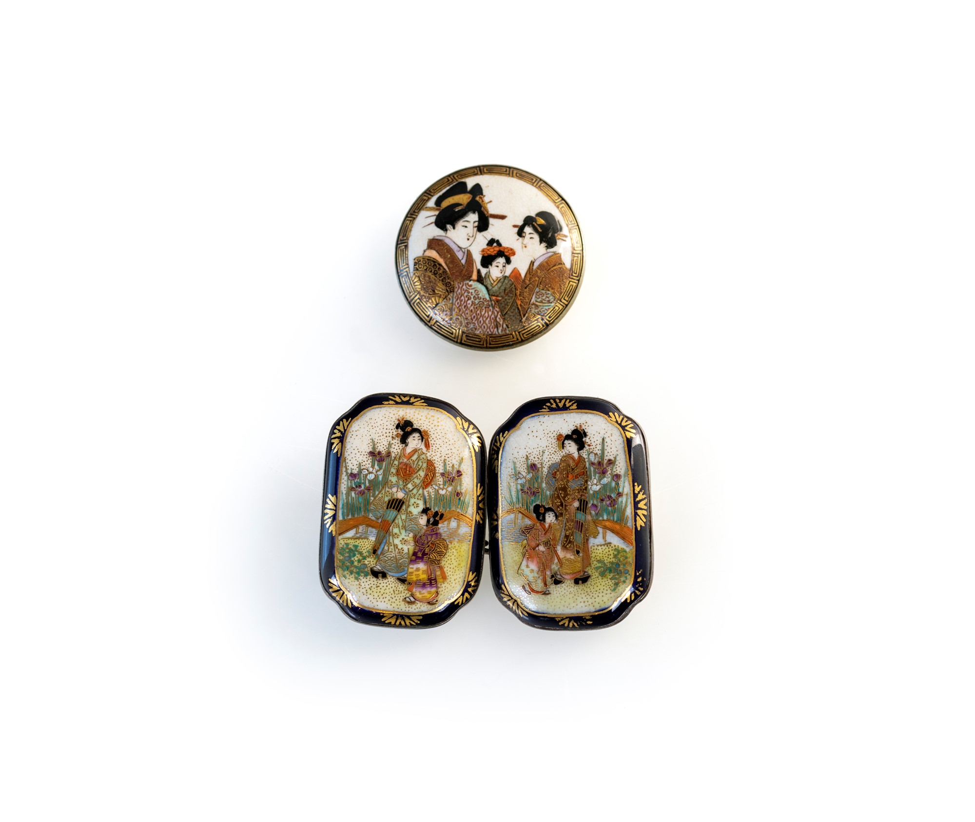 decorati da figure femminili con abiti e acconciature tradizionali.