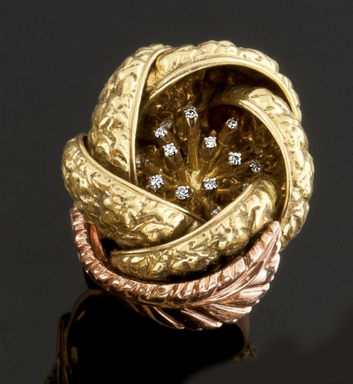 ANELLO Grande anello in oro giallo e rosa, a forma di peonia; nella parte...