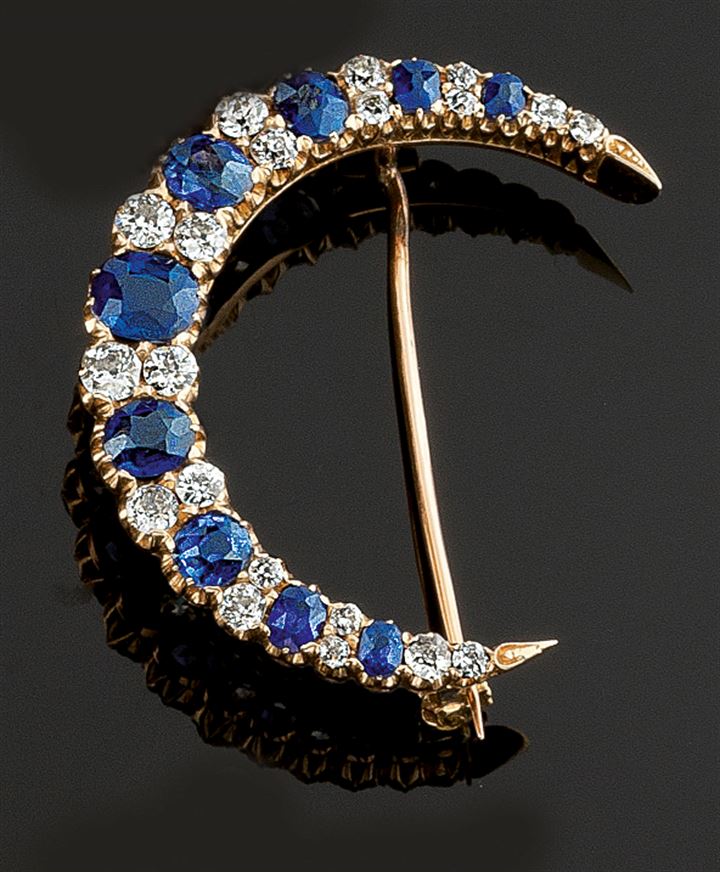 Spilla in oro giallo, fine XIX secolo inizi XX secolo, a forma di mezzaluna interamente in