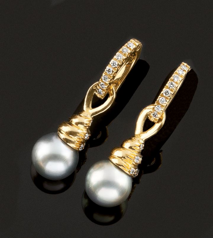 Coppia di orecchini in oro giallo con due perle Tahiti pendenti del diam di mm 10,1 e 10,2