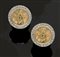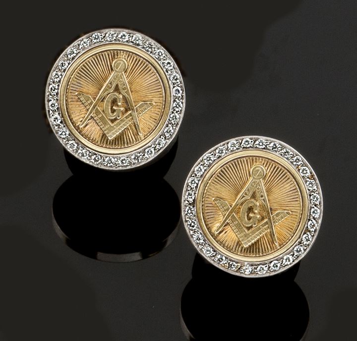 Coppia di gemelli in oro giallo con simboli massonici e diamanti taglio brillante per complessivi ct 0,30
