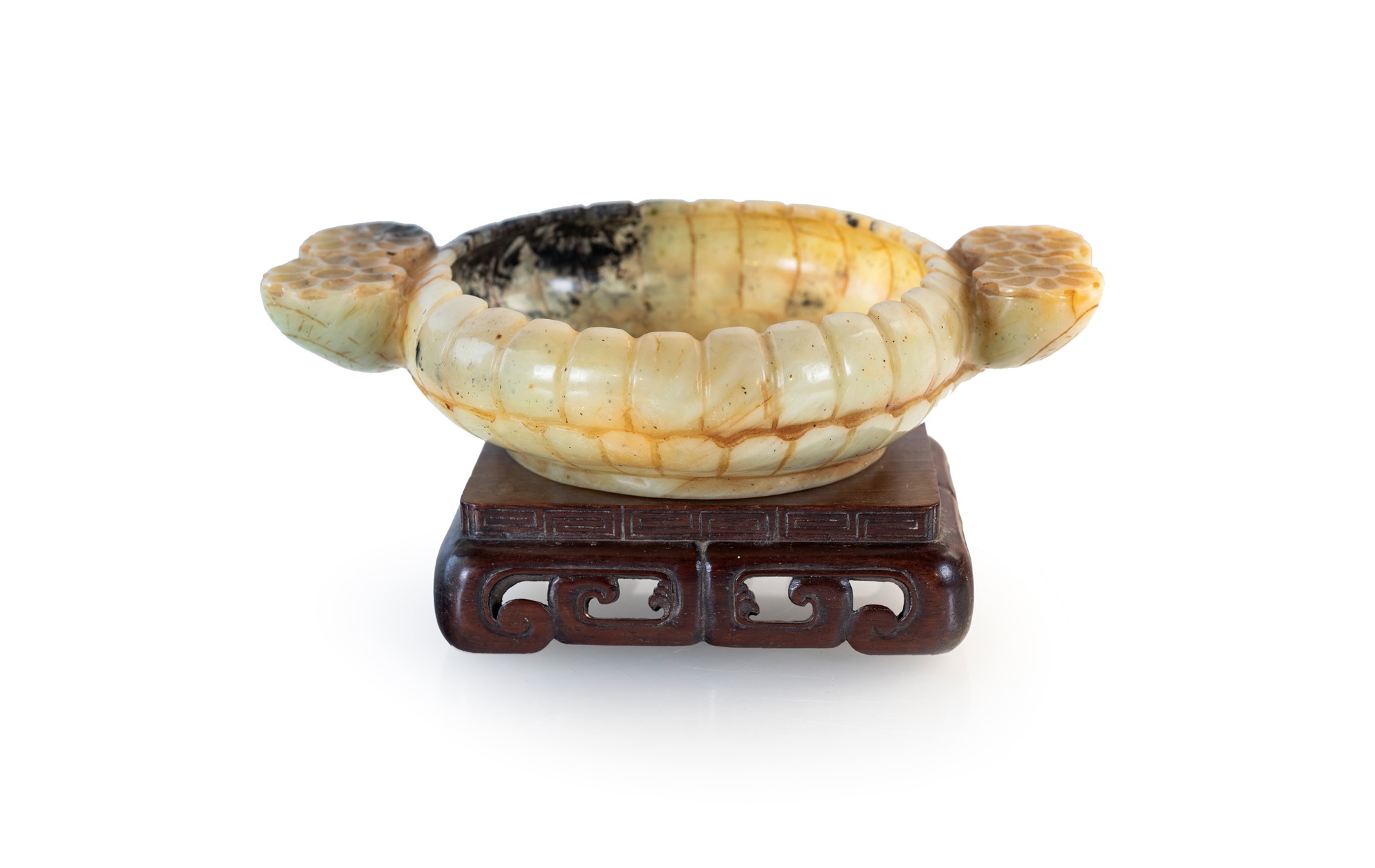 Coppa in giada di forma circolare con orlo incurvato, intagliata come una corolla; due fiori in coppia fungono da anse; base in legno. cm 5x21x15