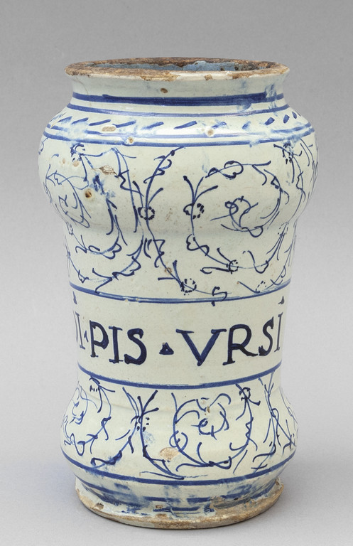 Albarello in ceramica con decorazioni a girali in blu su fondo bianco scritta medicinale Savona sec.XVII
