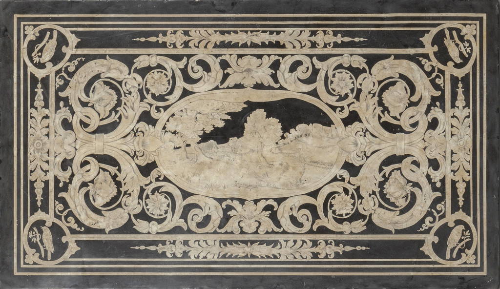 Scagliola decorata con paesaggio centrale contornato da motivi geometrici e uccelli Carpi sec.XVI-XVII