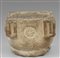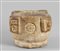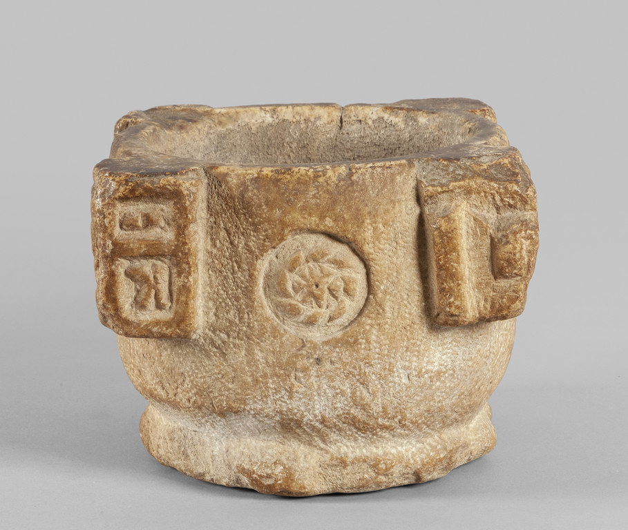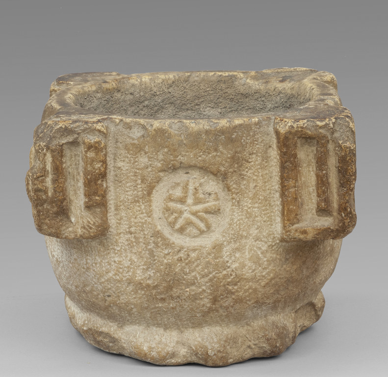 Mortaio gotico in marmo quattro spigoli di cui tre lavorati a motivi geometrici ed uno con profilo umano motivi floreali sui fianchi Italia Meridionale sec.XIII