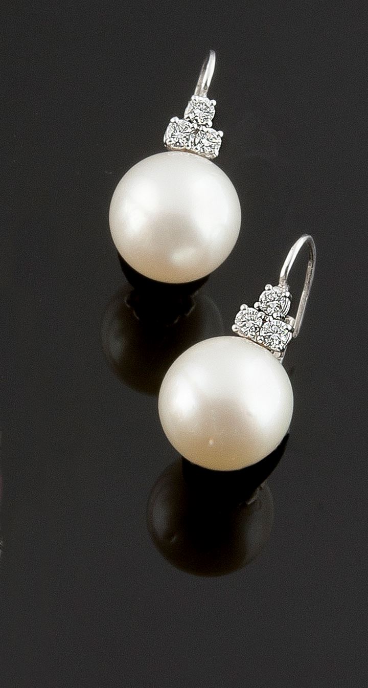 Coppia di orecchini in oro bianco, a monachella, con due perle australiane del diam di mm 14,8