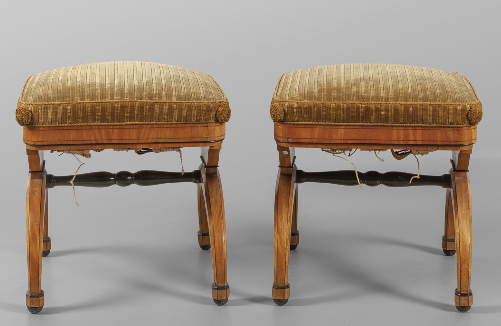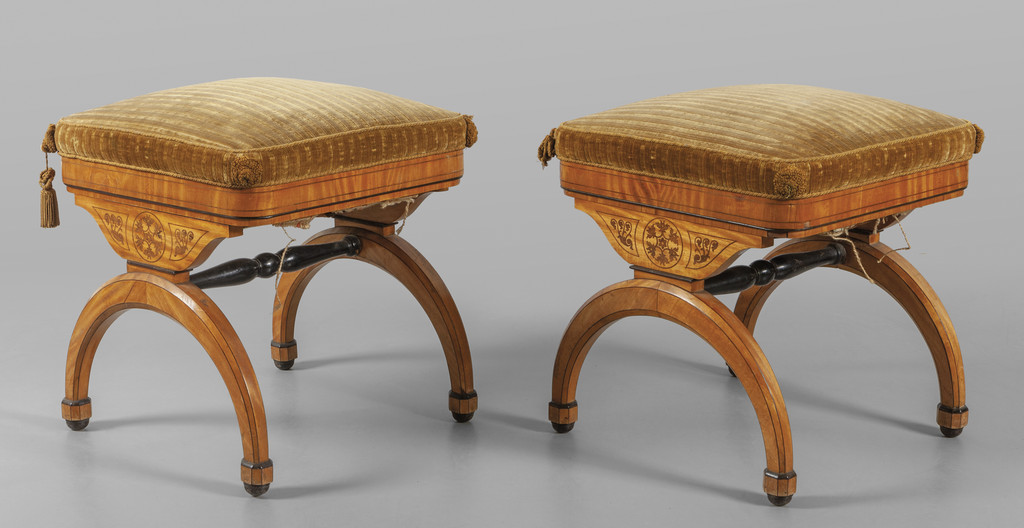 Coppia di sgabelli Carlo X di forma a tenaglia lastronati in acero e palissandro Piemonte I metà sec.XIX