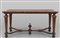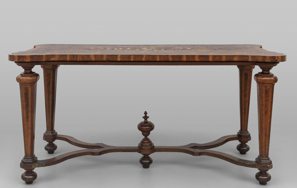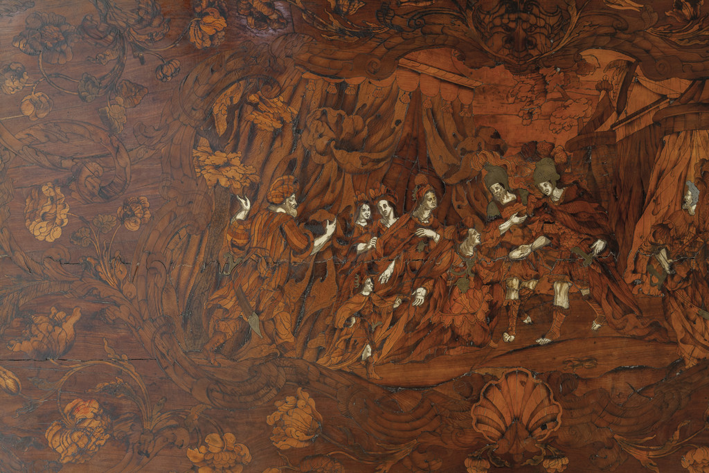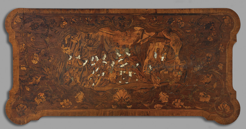 Importante tavolo a muro Luigi XIV piano finemente intarsiato con scena centrale in avorio peltro e legni vari sorretto da quattro gambe piramidali riunite da tramezza Padova sec.XVII-XVIII