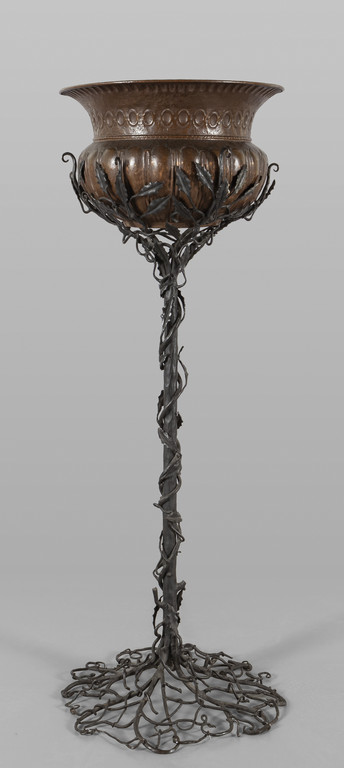 Antico bacile in rame sbalzato poggiante su base Liberty in ferro battuto intrecciata con foglie