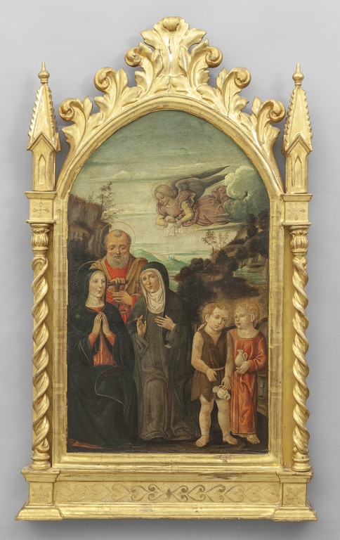 Scuola fiorentina sec.XV 'Sacra Famiglia con Santa Elisabetta e San Giovannino' tempera su tavola cornice a tempietto del sec.XIX
