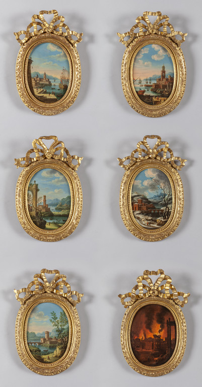 Scuola Nord Italia sec.XVIII 'Paesaggi' sei olii di forma ovale belle cornici in legno finemente intagliate e dorate con terminali a nastro