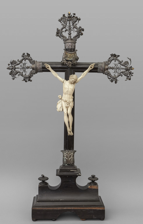 Crocefisso in avorio con Croce in ebano arricchito da canti in argento finemente sbalzato Genova sec.XVIII