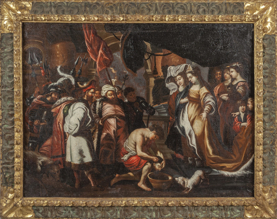 Scuola Italia Centrale sec.XVII 'La decollazione del Battista' olio bella cornice in legno intagliato laccato e dorato
