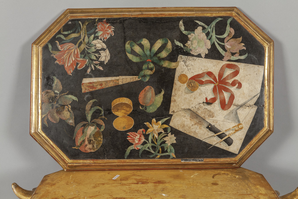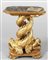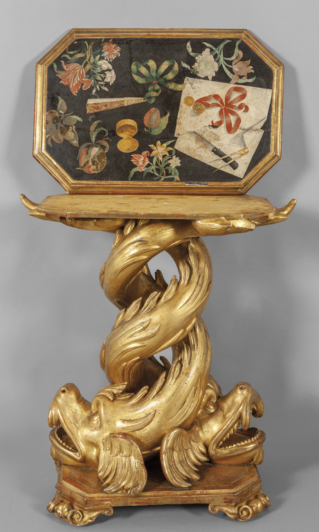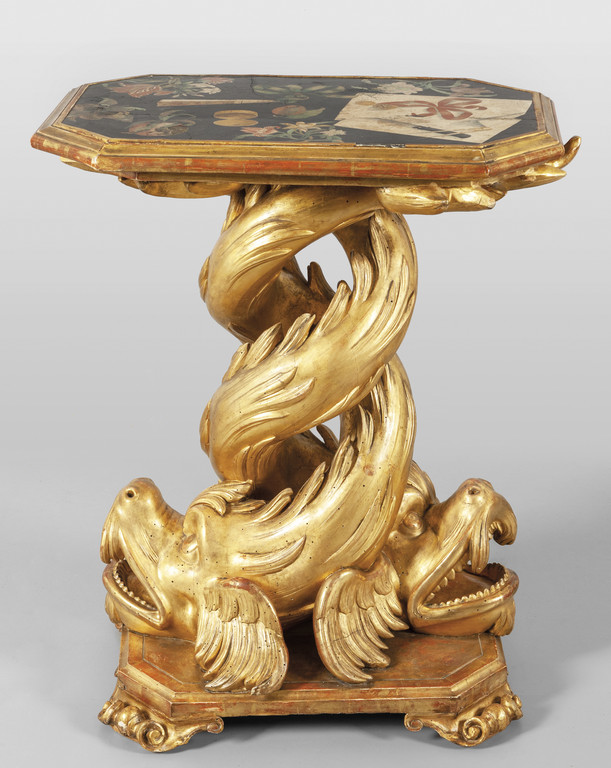 Tavolo da centro due delfini che si intersecano in legno finemente dorato ed intagliato formano la parte bassa che sostiene un piano in scagliola policroma Genova fine sec.XVIII
