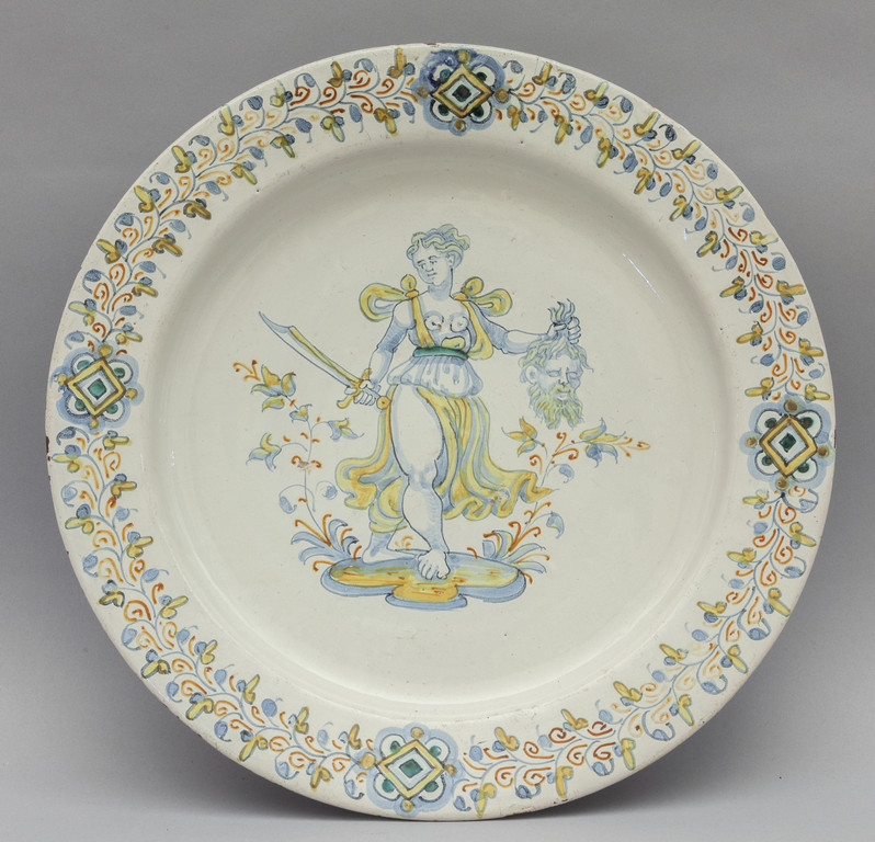 Grande piatto compendiario in ceramica decorato con Salomè con la testa del Battista Deruta sec.XVII